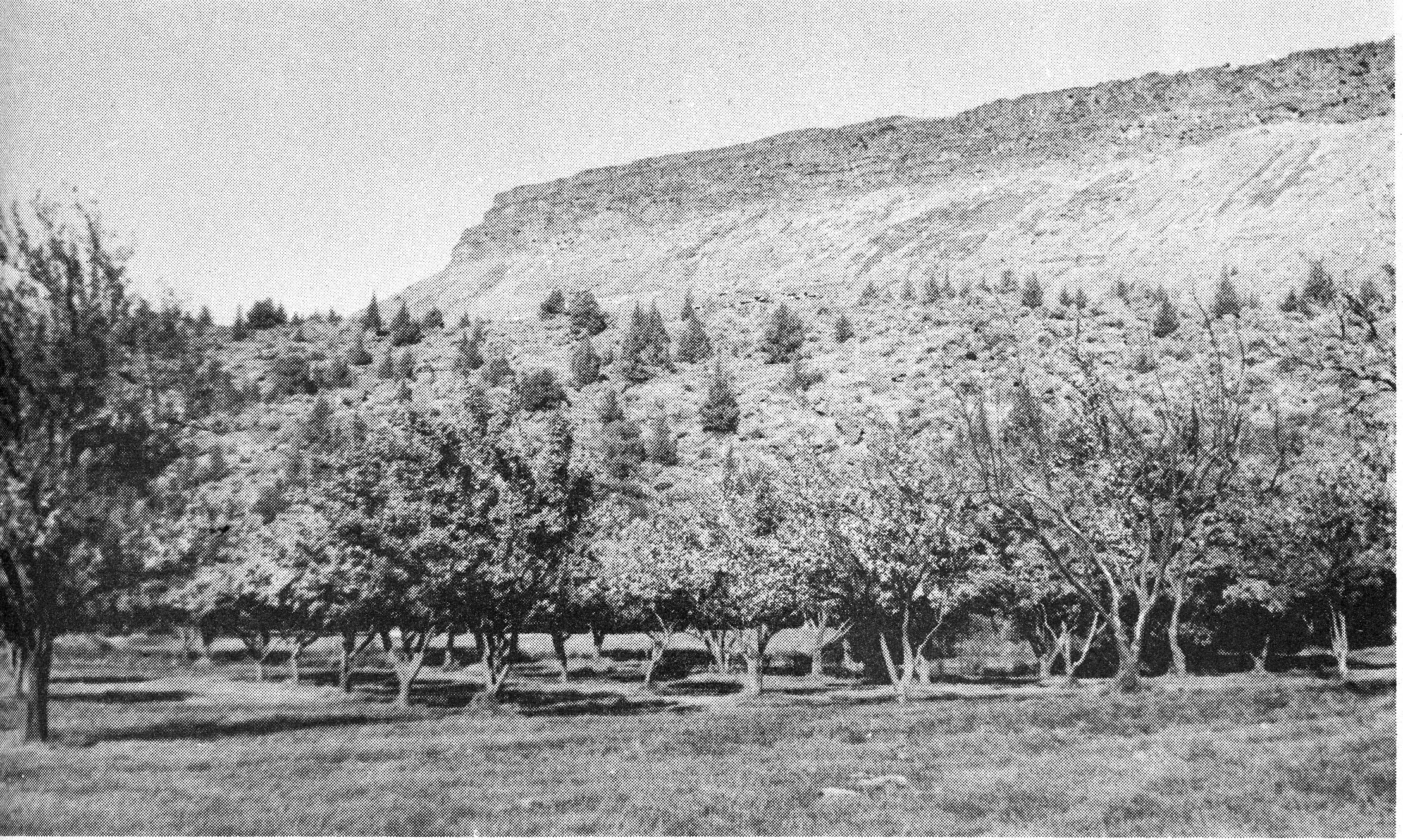 Historic photograph of the Cove Orchard before it was flooded by Lake Billy Chinook in 1964. The orchard, established by William Boegli in 1905, was the first sizeable commercial orchard in Central Oregon. Source: Jefferson County Historical Society.