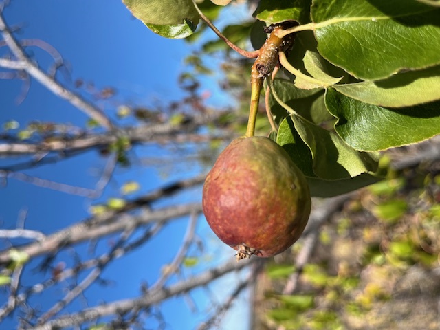 Red pear fruit on one of the 5 surviving pear trees at the Cyrus Barn orchard, photographed in 2024.