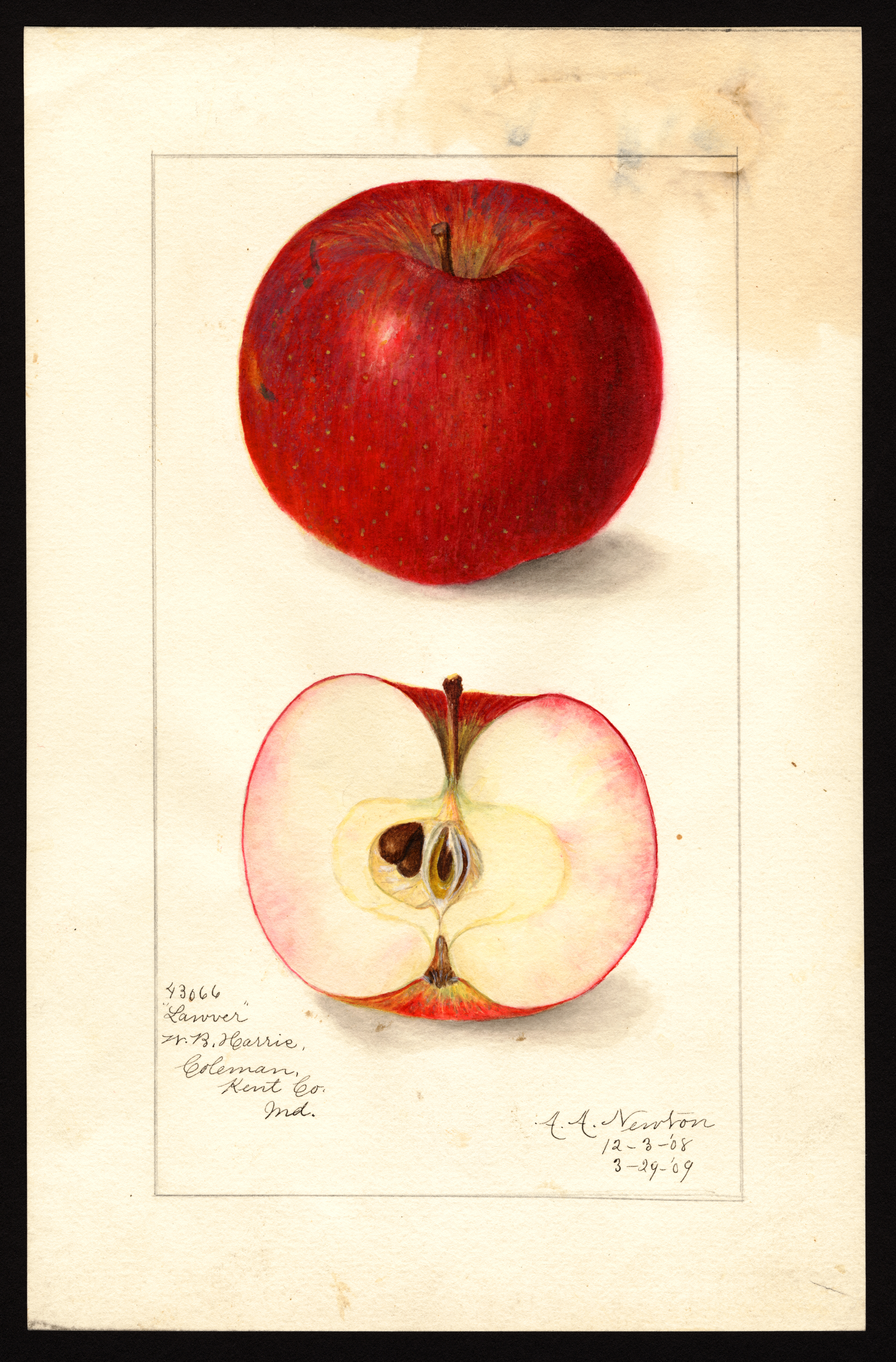 | current | 20:52, 31 January 2026 | 2,632 × 4,000 (7.81 MB) | Bot (talk | contribs) | == Summary == USDA Pomological Watercolor of Lawver apple. * '''Artist:''' Newton, Amanda Almira ca. 1860-1943 creator artist USDA * '''Source:''' U.S. Department of Agriculture Pomological Watercolor Collection. Rare and Special Collections, National Agricultural Library, Beltsville, MD 20705 * '''Identifier:''' POM00002663 * '''License:''' Public Domain Category:USDA Pomological Watercolors Category:Apple variety images |