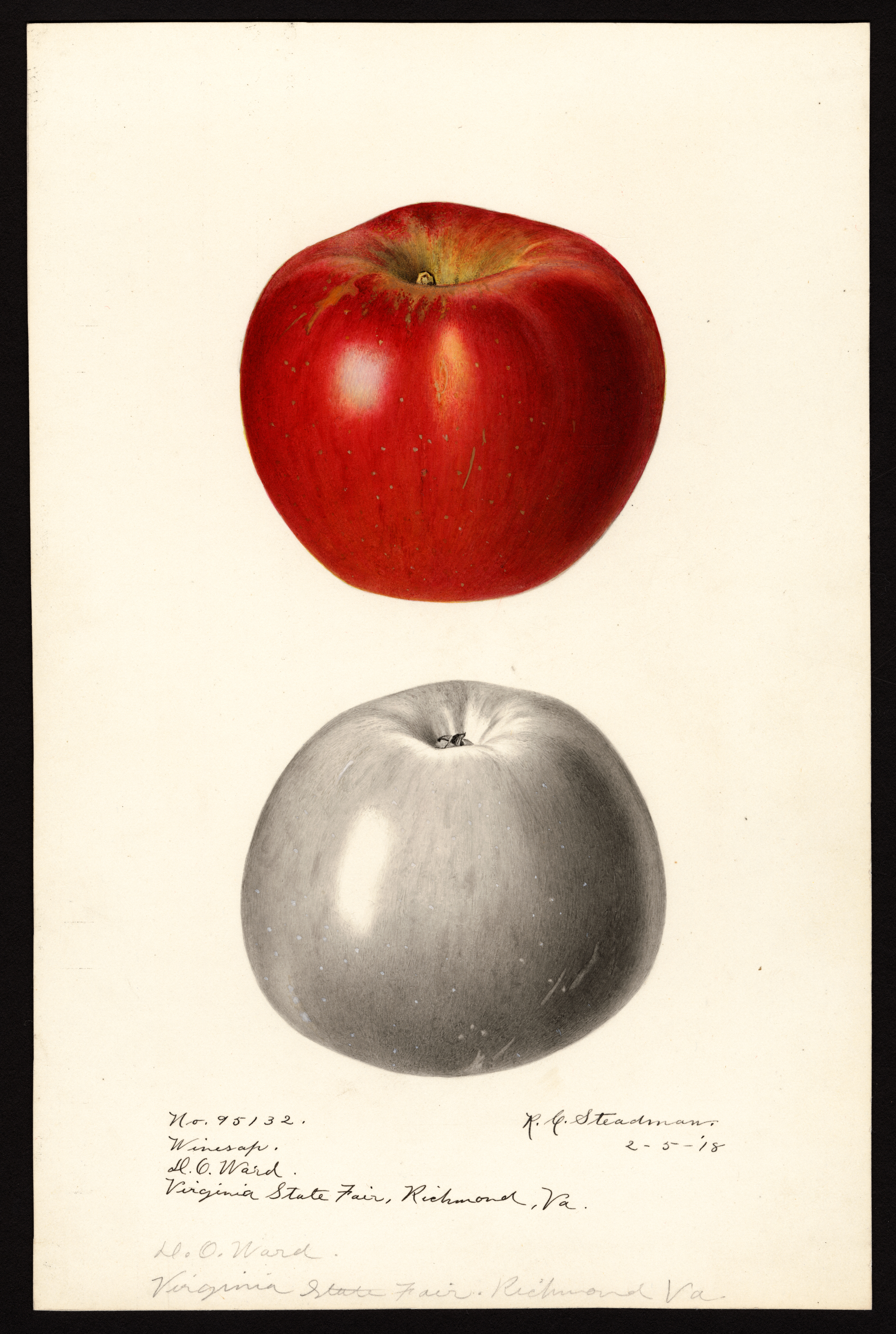 | current | 21:55, 31 January 2026 | 2,687 × 4,000 (5.81 MB) | Bot (talk | contribs) | == Summary == USDA Pomological Watercolor of Winesap apple. * '''Artist:''' Steadman, Royal Charles b. 1875 creator artist USDA * '''Source:''' U.S. Department of Agriculture Pomological Watercolor Collection. Rare and Special Collections, National Agricultural Library, Beltsville, MD 20705 * '''Identifier:''' POM00004233 * '''License:''' Public Domain Category:USDA Pomological Watercolors Category:Apple variety images |