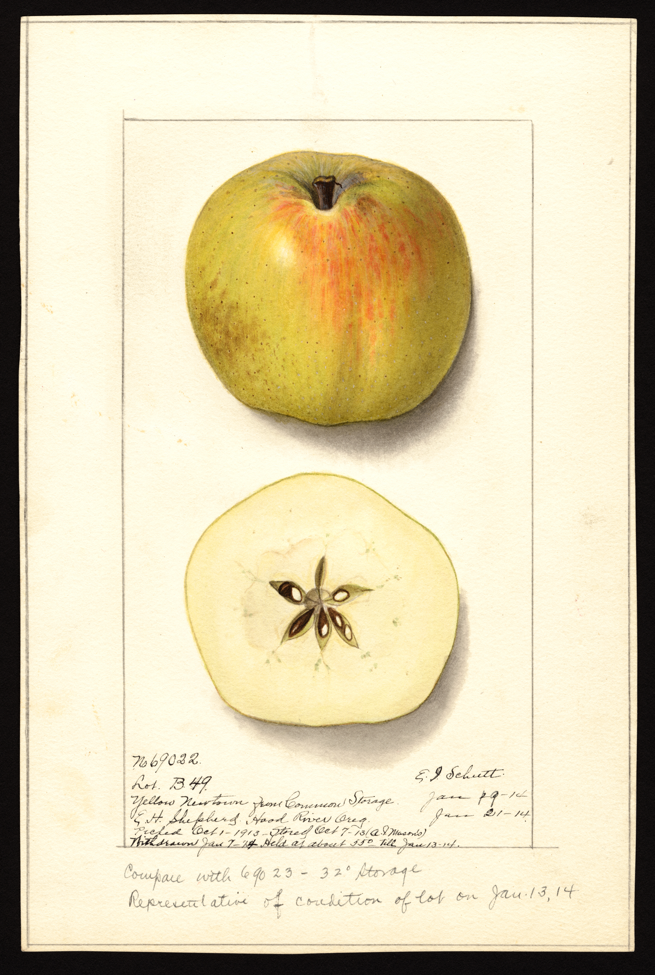 USDA Pomological Watercolor of Yellow Newtown/Newtown Pippin apple.