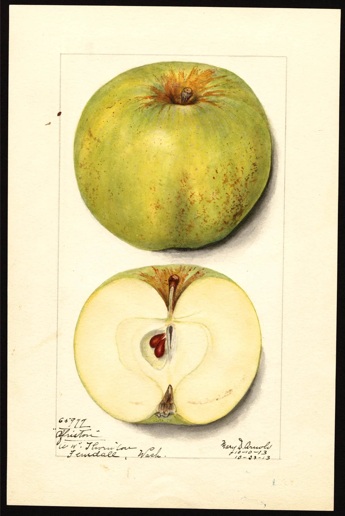 A third-rate Apple, valued in England for cooking. Fruit large, roundish, a little ribbed, and rather broadest at the base, pale greenish-yellow. Flesh yellowish-white, crisp, tender, with a tolerable, somewhat acid flavor. Good. October to January.