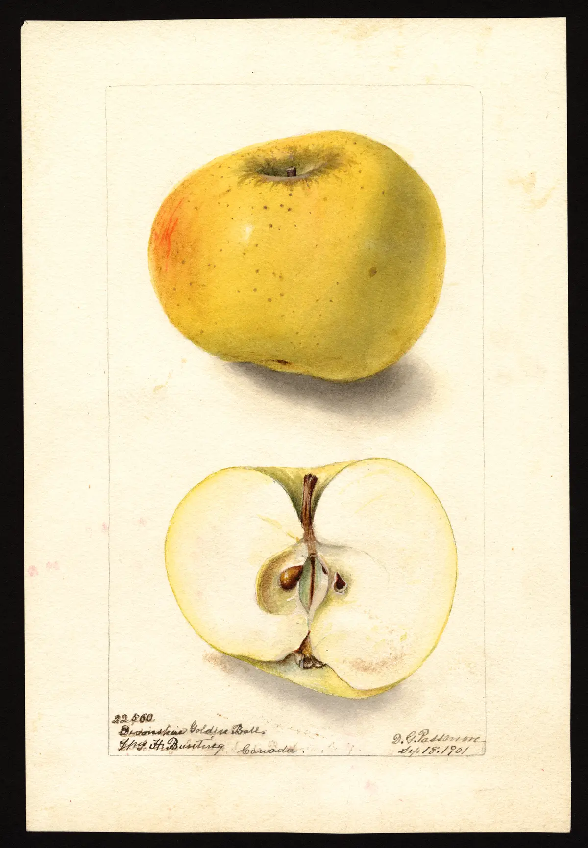 — A.J. Downing, The Fruits and Fruit Trees of America (1900)Devonshire Golden Ball. An English Apple, described by Ronalds as follows: Fruit large, globular, straw-colored, with flesh of unstriped carmine. A beautiful sauce apple, with an agreeable acid. January and February. Tree grows well and bears freely.
