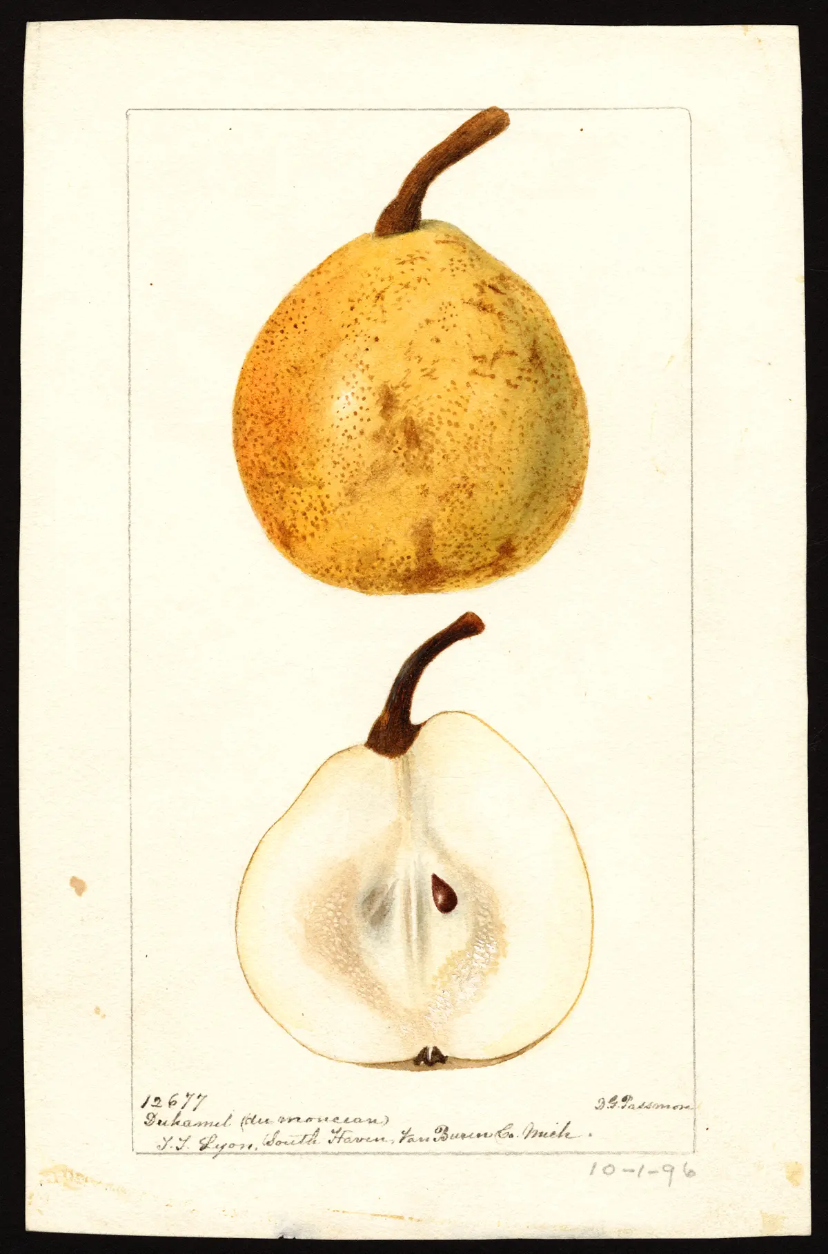 — John J. Thomas, The American Fruit Culturist (1903)Duhamel du Monceau. Large, long pyriform, light yellow, partly russeted; flesh melting, juicy, excellent. Early winter. French.