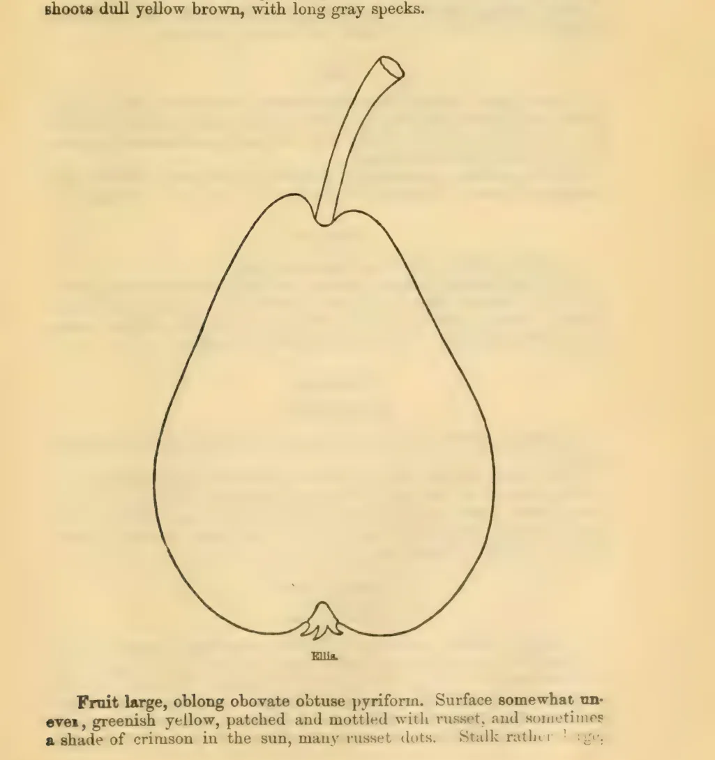 - Mag. Hort. 30:370, fig. 13. 1864. 2. Downing Fr. Trees Am. 755, fig. 1869. Raised from seed of Seckel in 1843 by Annie E. Ellis, New Bedford, Mass. Tree vigorous, hardy, prolific. Fruit large, oblong-obovate-pyriform, truncate, slightly uneven, greenish-yellow, patched and mottled with russet, sprinkled with many russet dots; stem rather long, rather stout, set in a small cavity; calyx large, open; basin uneven, slight; flesh whitish, juicy, melting, sweet, slightly vinous, aromatic; very good; Sept. and Oct.