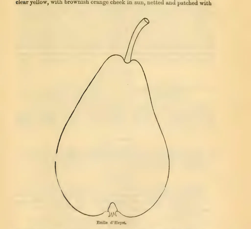 — John J. Thomas, The American Fruit Culturist (1903)Emile d'Heyst. Large, long pyriform (like the Winkfield) ; light green with some brown russet; stem variable, rather long, sometimes fleshy; calyx small, basin narrow, deep, and knobby; buttery and melting, fine, perfumed. November. Shoots long, brownish-yellow, diverging and straggling. Fig. 645.