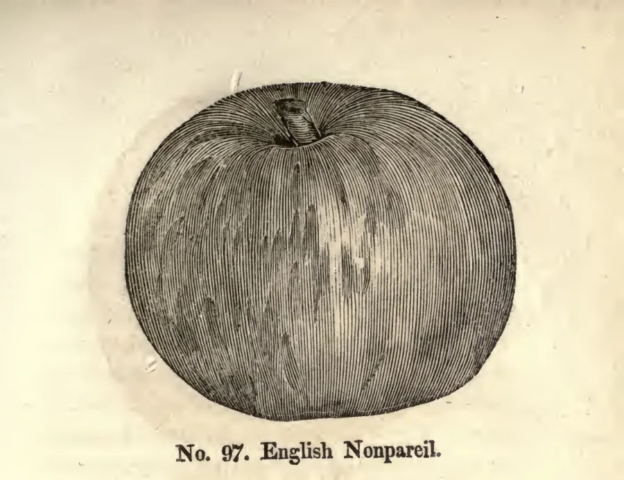 — William Coxe, A View of the Cultivation of Fruit Trees (1817)NO. 97. ENGLISH NONPAREIL. This apple is about the middling size; the form is flat; the skin rough, of a dull green, partaking of a small portion of russet, mixed with black clouds and spots: the flesh is rather dry, has a sprightly taste, but does not appear to be so highly flavoured in our climate as in England, where it is thought to be their finest table fruit; the tree is of a straight and upright form; regular growth, and great fruitfulness; it ripens in November, and keeps through the winter.