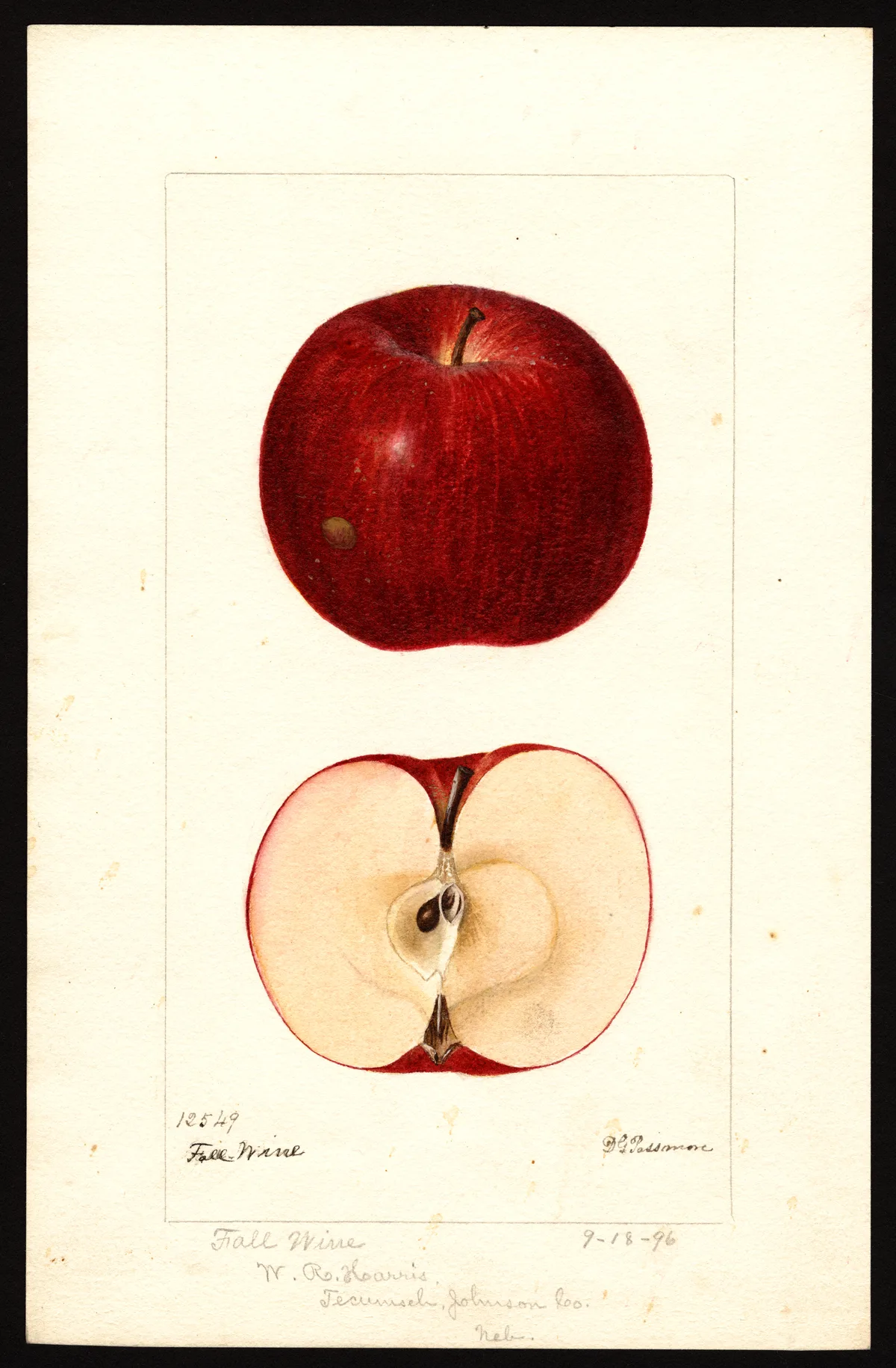 — John J. Thomas, The American Fruit Culturist (1903)Fall Wine.* Medium to large, roundish-oblate; color a rich red, faintly striped on a rich yellow skin; stem slender; flesh yellow, crisp, tender, juicy, with a mild, rich, scarcely sub-acid flavor. Mid-autumn till winter. Fig. 382. Succeeds best in the West—often scabby at the East.