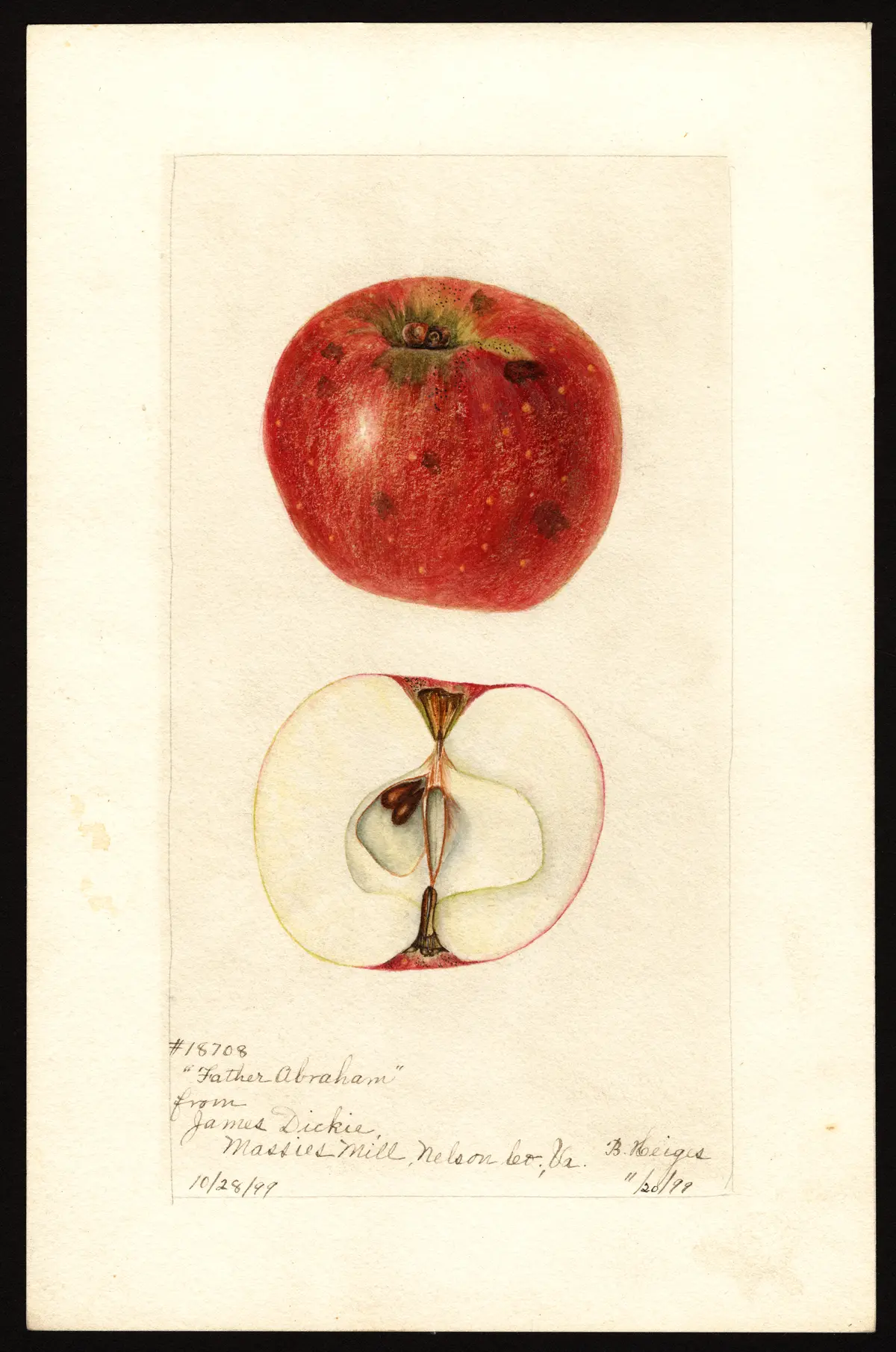 — John J. Thomas, The American Fruit Culturist (1903)Father Abraham. Small, flat, red; flesh white, pleasant. Keeps well. Va. and Ky.