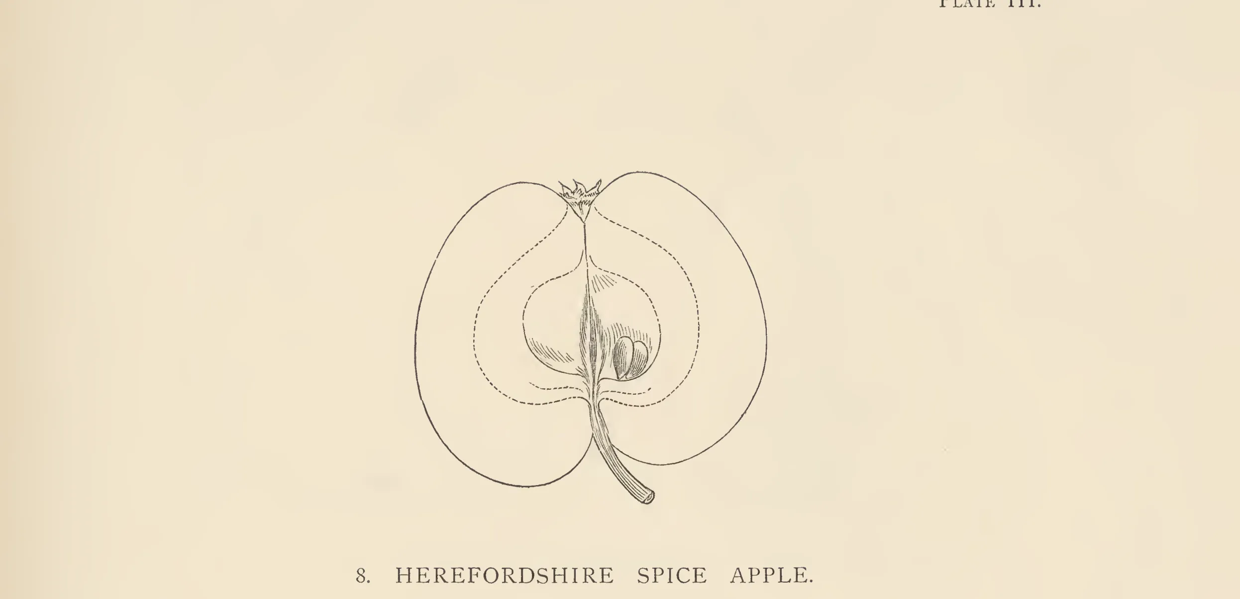There are several varieties of apples known by the name of Spice Apple, and this differs from all of that name which have been described in pomological works. We have therefore for the sake of distinction called it the Herefordshire Spice Apple. Forsyth describes one which in a MS. list in our possession he says he had from Mr. Jones of Fawley, Herefordshire; but he describes it as being of a yellow colour only. It is possible that it might have been a pale specimen for he says it is "a handsome middle-sized angular-shaped apple," ripe in January and keeps till March.