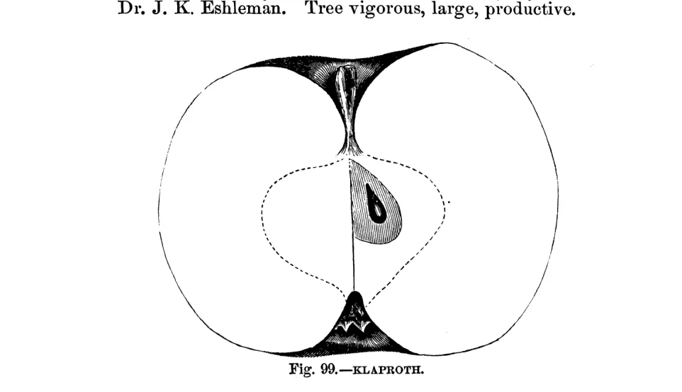 — John J. Thomas, The American Fruit Culturist (1903)Klaproth. Size medium, oblate; streaked and stained with red on greenish yellow; stalk short, cavity deep; basin wide, even; flesh white, crisp, with a pleasant sub-acid flavor. Tree a strong grower and great bearer. Fruit bears carriage well. A good market sort. Lancaster County, Pa. August to October.