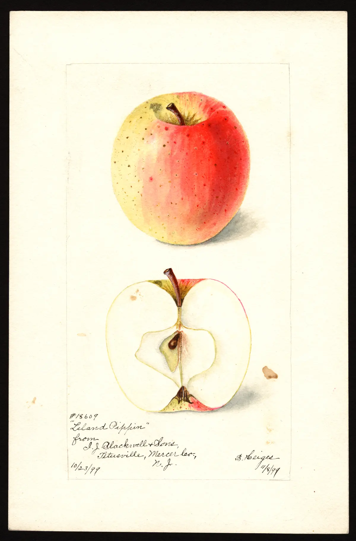 — John J. Thomas, The American Fruit Culturist (1903)Leland Spice. (Leland Pippin.) Large, roundish, obscurely conical, slightly ribbed; whole surface with brilliant red streaks on yellow ground, dotted with yellow; stalk half an inch long; cavity and basin ribbed; flesh yellowish white, sub-acid, spicy, rich, fine. October. Origin, Sherburne, Mass.