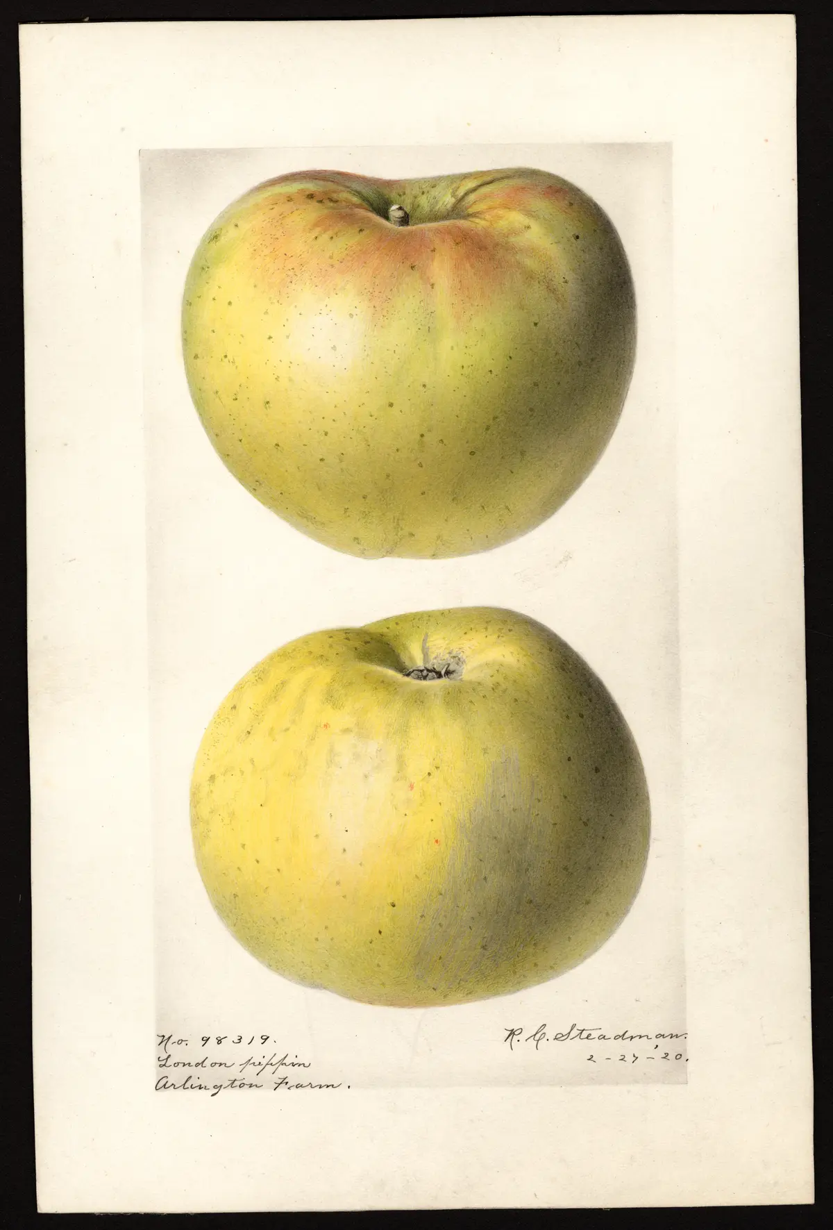 — John J. Thomas, The American Fruit Culturist (1903)London Pippin. Large or very large, roundish, slightly flattened, obtuse-conical; greenish yellow; stalk very short; calyx large, in a smooth even basin; flesh sub-acid, of a good second-rate flavor. Early winter. Much cultivated in Northern Virginia; and from its large size and handsome appearance sells well in the Washington market. Productive.