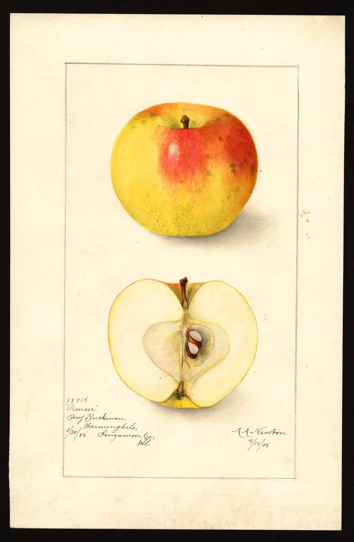 — A.J. Downing, The Fruits and Fruit Trees of America (1900)Pioneer. From Pennsylvania. Fruit medium, roundish oblate conic, yellow, shaded with light red, and splashed and striped with dark red, many small light and gray dots. Stalk rather short. Calyx closed. Flesh whitish yellow, tender, juicy, pleasant subacid, slightly aromatic. Good. Core small. October, November.
