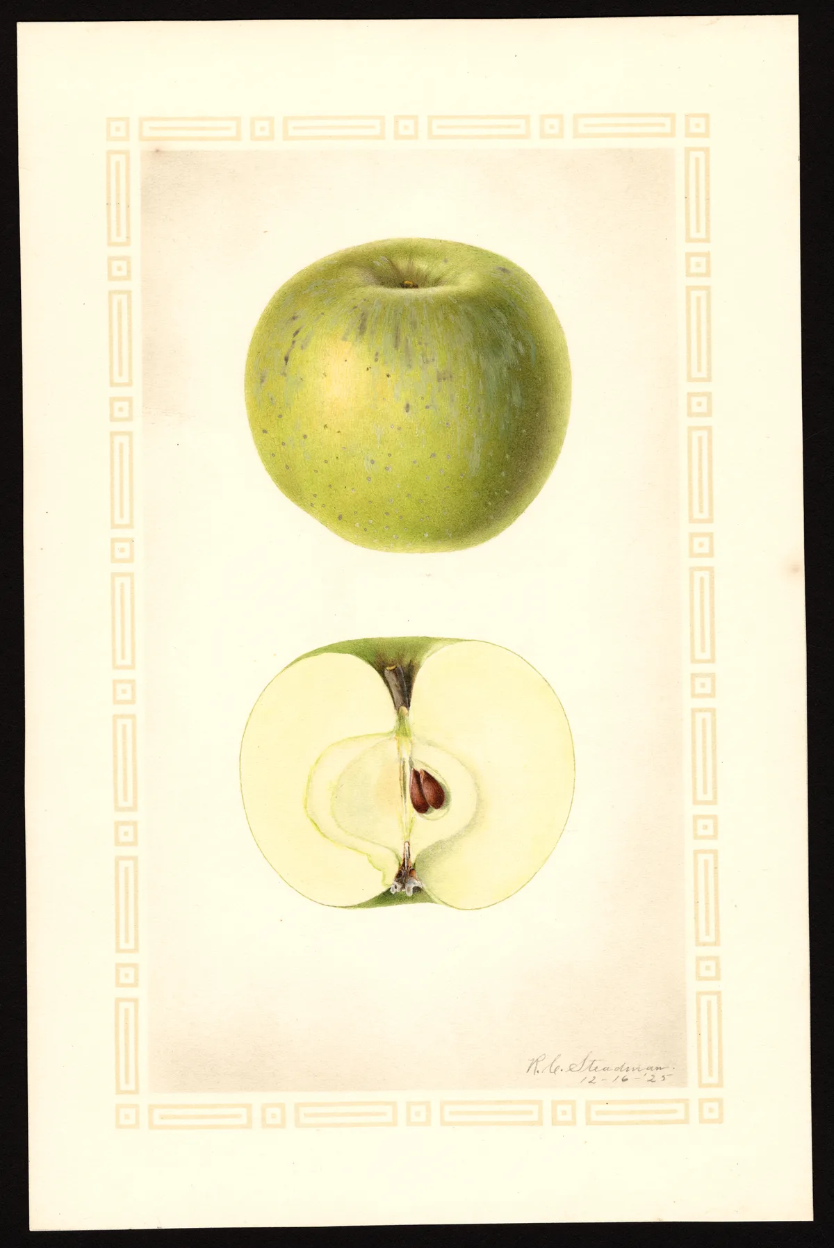 FRUIT. Fruit large to very large, pretty uniform in size and shape. Form globular to roundish conic, sometimes irregularly elliptical or prominently ribbed. Stem very short, stout, often inserted under a lip or having itself a fleshy protuberance. Cavity acuminate, moderately shallow to rather deep, narrow to moderately wide, often somewhat furrowed or lipped, sometimes russeted and with outspreading russet. Calyx medium to rather large, open; lobes often separated at the base, short, broad, acute. Basin small to medium in size, moderately shallow to rather deep, narrow to moderately wide, abrupt to somewhat obtuse, often slightly furrowed or wrinkled. Skin rather thin, tough, smooth, at first green but eventually clear yellow marbled with greenish-yellow. Stripes of whitish scarf-skin radiate from the cavity. Well colored specimens occasionally show a brownish-red blush but never a distinct red color. Dots conspicuous, whitish, often areolar with russet center. Calyx tube rather wide, conical or elongated cone-shape or sometimes slightly funnel-form. Stamens median to basal. Core medium to rather large, axile; cells symmetrical, closed or somewhat open, not uniformly developed; core lines clasping. Carpels thin, broadly roundish, but slightly emarginate if at all, often tufted. Seeds medium to rather small, wide, plump, acute, light brown, tufted. Flesh tinged with yellow firm, medium in texture, crispness and juiciness, decidedly sweet with a peculiar flavor; good for culinary use and especially esteemed for baking. Season October to January.