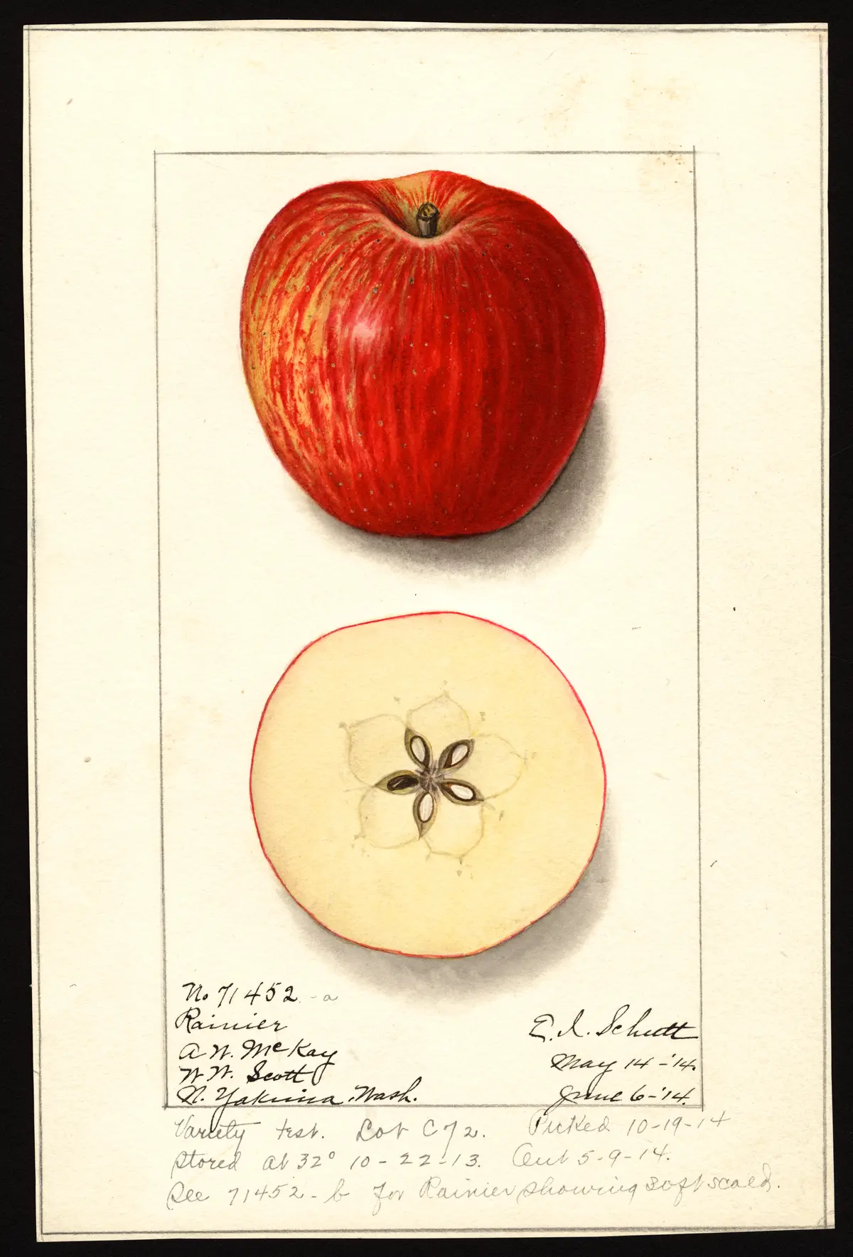 The Rainier variety originated in an orchard in Washington, with the original 54 trees planted approximately 30 years prior to 1914. The source of the original scions and nursery stock could not be determined despite thorough investigation. Prior to W. W. Scott's ownership, the fruit had been marketed under various names. When Scott acquired the orchard, the previous owner had begun grafting Spitzenburg scions onto the trees, intending a complete replacement. However, Scott elected to preserve the original trees, recognizing that the Spitzenburg grafts would require several years to produce fruit. The variety was named "Rainier" as being suggestive of its geographic locality.