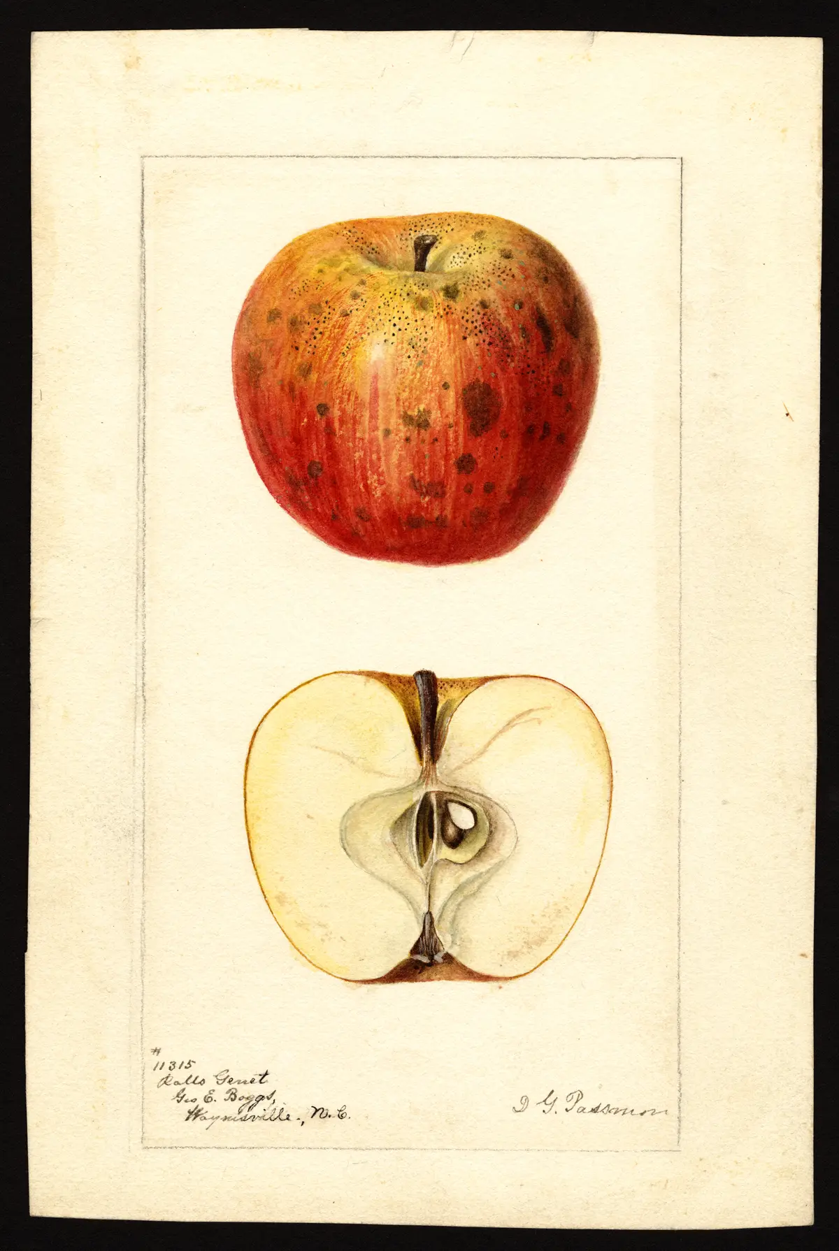 — John J. Thomas, The American Fruit Culturist (1903)Rall's Genet.* (Rawle's Jenneting. Neverfail, Rockremain.) Medium in size, roundish, approaching oblong or obtuse-conical, often oblique; color pale red, distinct stripes on light yellow ground; stalk half an inch long; flesh nearly white, fine, mild, sub-acid, fine texture, crisp, juicy. Growth slow; a profuse bearer, with a portion of the crop knotty or under size. Keeps through spring. Highly esteemed in the Ohio valley; does not succeed farther North. The blossoms open ten days later than usual, thus sometimes escaping spring frosts; hence the name Neverfail. Hardy far West. Fig. 428. France.
