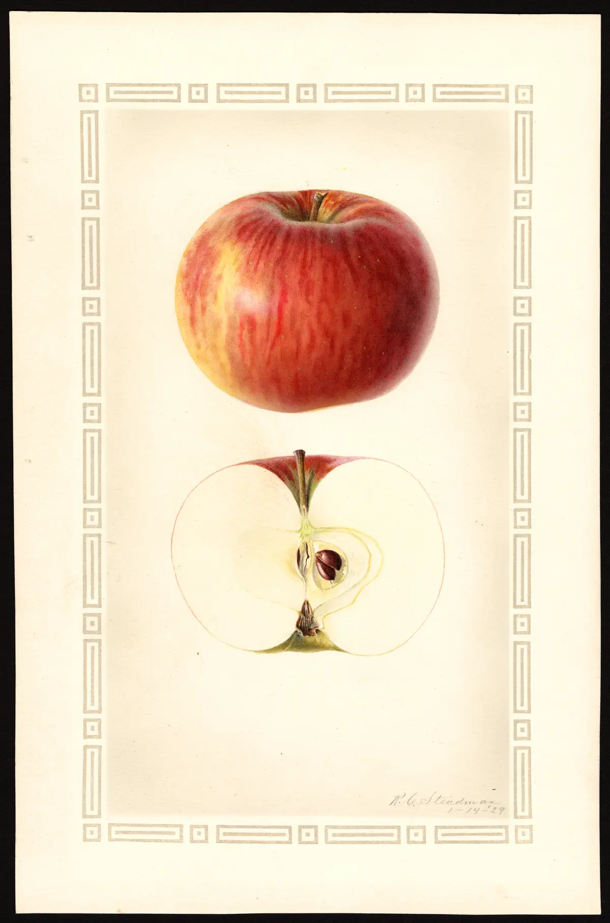 Fruit medium to nearly large, uniform in shape but not in size. Form oblate conic, pretty regular but sometimes elliptical. Stem medium in length, slender to moderately thick. Cavity acute, varying from nearly acuminate to somewhat obtuse, deep, broad, rather symmetrical, sometimes compressed, often with outspreading russet rays. Calyx small to below medium, closed or slightly open; lobes rather short, moderately narrow. Basin rather shallow to moderately deep, rather wide, obtuse to somewhat abrupt, somewhat furrowed and wrinkled, often compressed. Skin rather pale yellow, usually entirely overspread with attractive red, irregularly splashed and striped with carmine. Dots small to medium, grayish. Calyx tube medium size, moderately wide, conical to short funnel-shape. Stamens median to nearly basal. Core below medium size, widely abaxile; cells symmetrical, usually open; core lines meeting or slightly clasping. Carpels cordate to broadly ovate. Seeds rather dark brown, medium size, rather narrow, plump, acute. Flesh white, fine, crisp, tender, juicy, pleasant subacid, aromatic, rather sprightly, good to very good. Season October to January.