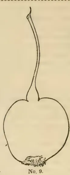 — B. Desportes, The Horticulturist (1856)No. 9. The Showy Crab — Spectabilis. Fruit, about three-fourths of an inch high, and three-fourths of an inch in diameter; form, very irregular, almost square; stalk, three and a half inches long, large at the upper part, large, fleshy at the base, inserted at the surface and crowded by wrinkles ; eye or calyx, very broad, large profound segments, numerous and out the surface; the cavity is formed by small wrinkles, irregular; yellow color, slightly spotted with rose on the sunny side, speckled with white dots upon the surface.