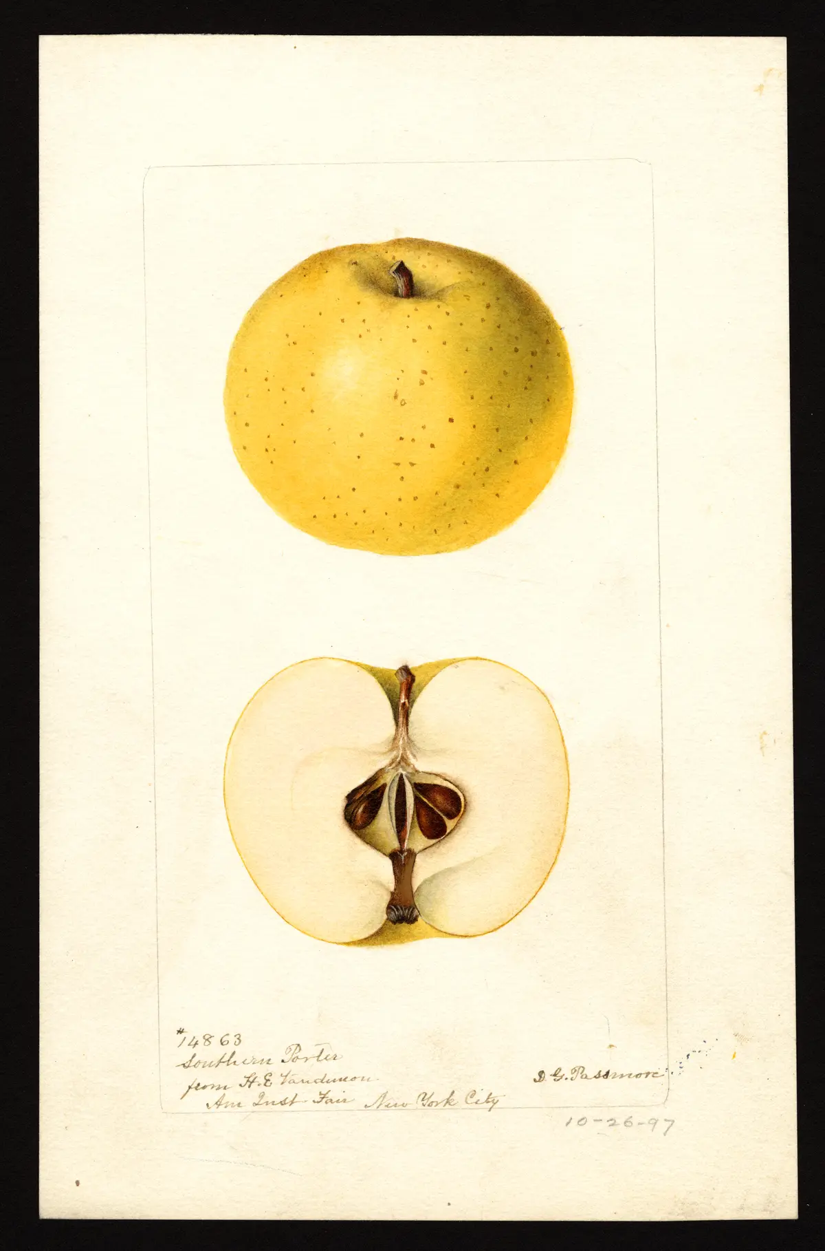 — John J. Thomas, The American Fruit Culturist (1903)Southern Porter. Medium, ovate, bright yellow, rich sub-acid. Ripens several weeks after Porter, or in September in California.