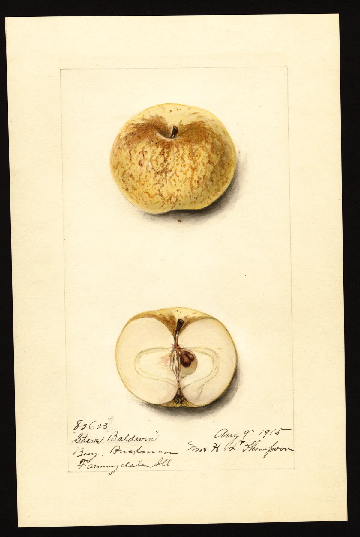 A chance seedling found in the woods on the farm of Stephen Baldwin, town of Seymour, Connecticut. The tree is highly esteemed where known and is considered worthy of a place in every orchard. It is said to be valuable for home use.