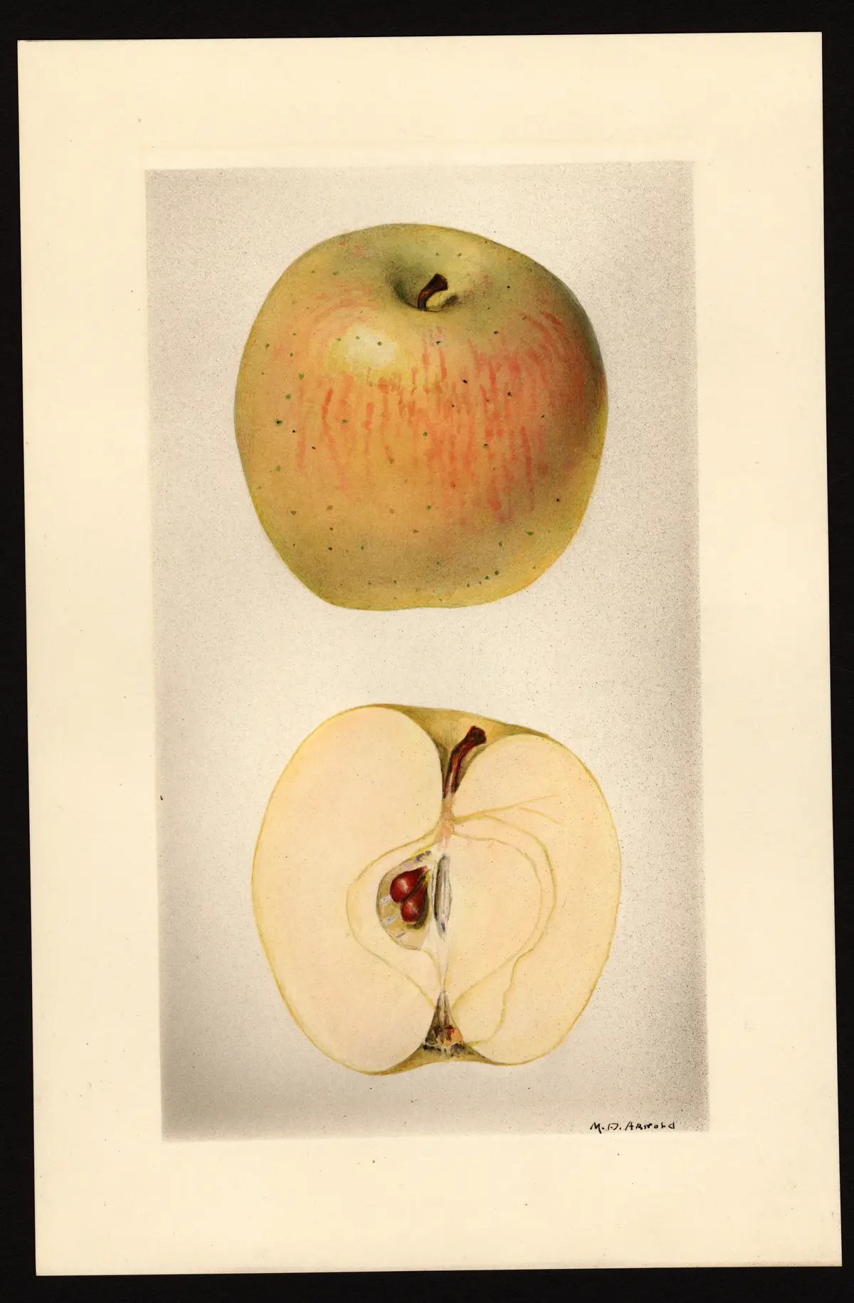 This fruit bears considerable resemblance in form and color to Yellow Bellflower. Flesh tender, subacid, good. It is in season from the middle of August to the middle of September. The tree is erect, of medium size, a good grower, hardy and a good cropper. It is not considered a satisfactory variety for commercial planting and so far as we can learn is gradually becoming obsolete in New York. Downing described it in 1848 as a new variety of promise and stated that it was raised by John R. Comstock of Washington, Dutchess county, N. Y., from seed of the Esopus Spitzenburg (1, 6). It was entered on the list of the American Pomological Society in 1875 as a variety of value for Nebraska (8). It was dropped from that list in 1897. A distinct variety of Pennsylvania origin has also been known under the name Summer Bellflower (6, 7).