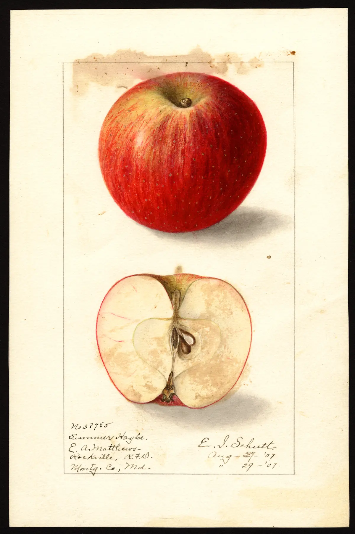 — John J. Thomas, The American Fruit Culturist (1903)Summer Hagloe. Size medium, roundish conic; streaked with bright red on yellow ground; stalk rather short and thick; flesh very soft, rich, of fine quality. Ripens at the end of summer. An excellent culinary variety. Shoots dark, strong, thick; terminal buds very large. This is wholly distinct from the Hagloe Crab, a late, small, ill-shaped, ovate fruit, cultivated only for cider.