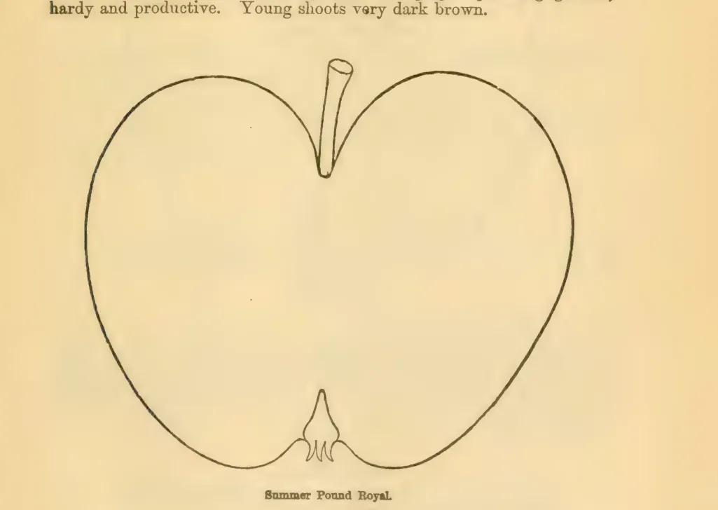 — John J. Thomas, The American Fruit Culturist (1903)Summer Pound Royal. Large, roundish-conic, greenish-white; fine-grained, tender, sub-acid, very good. End of summer. Profitable. Grown in Ohio and Mich.