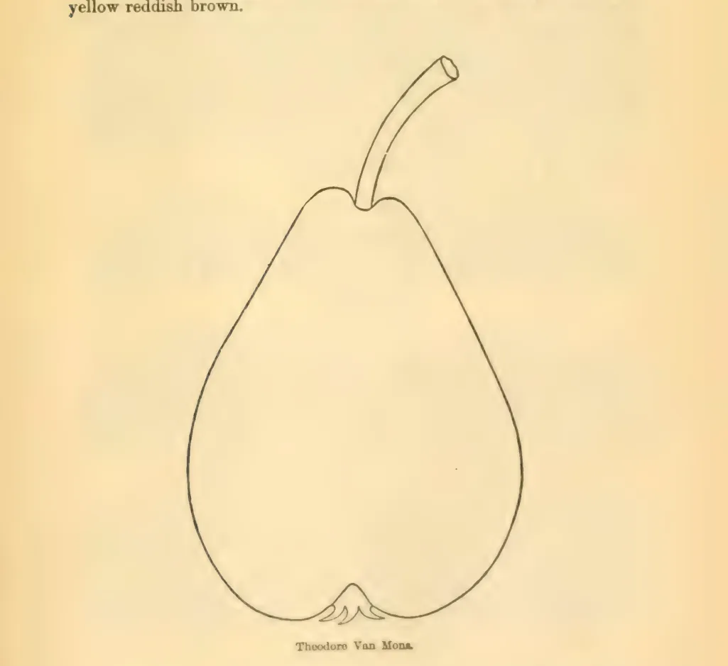 — John J. Thomas, The American Fruit Culturist (1903)Theodore Van Mons. Rather large, obovate-pyriform, sometimes long pyriform; greenish yellow, somewhat russeted; stalk an inch long, scarcely sunk; calyx large, open; flesh granular, juicy, melting, varying from good to very good. September, October. Tree vigorous and productive on pear or quince. Fig. 706.