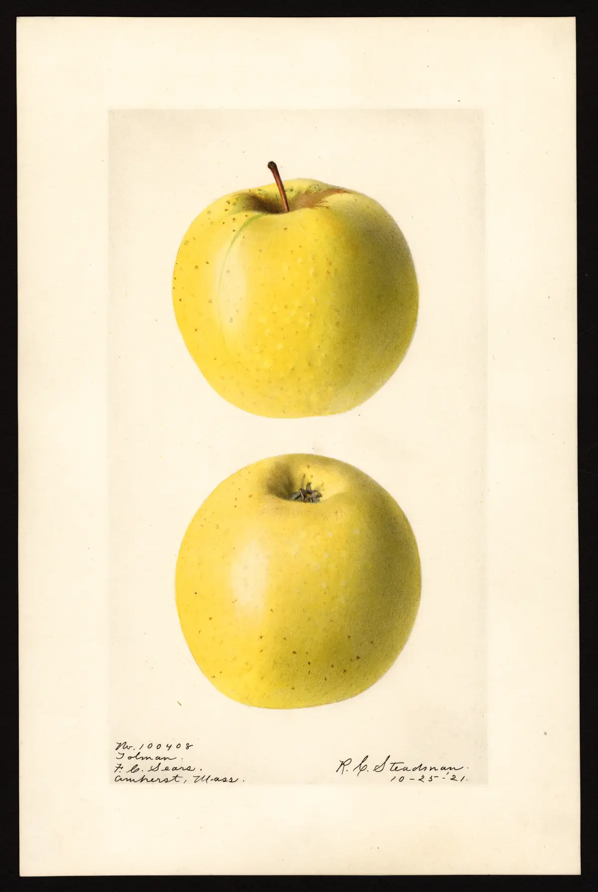 — John J. Thomas, The American Fruit Culturist (1903)Tolman Sweet.* Medium or rather large, roundish-oblate slightly conical; clear light yellow, with a clear brownish line from stalk to apex; stalk nearly an inch long; calyx in a distinct, slightly wrinkled basin; flesh white, firm, rich, very sweet. Excellent for winter baking. Keeps into spring. Young tree vigorous, upright, shoots becoming spreading; leaves wavy. Fig. 406. Productive. Hardy. Rhode Island.