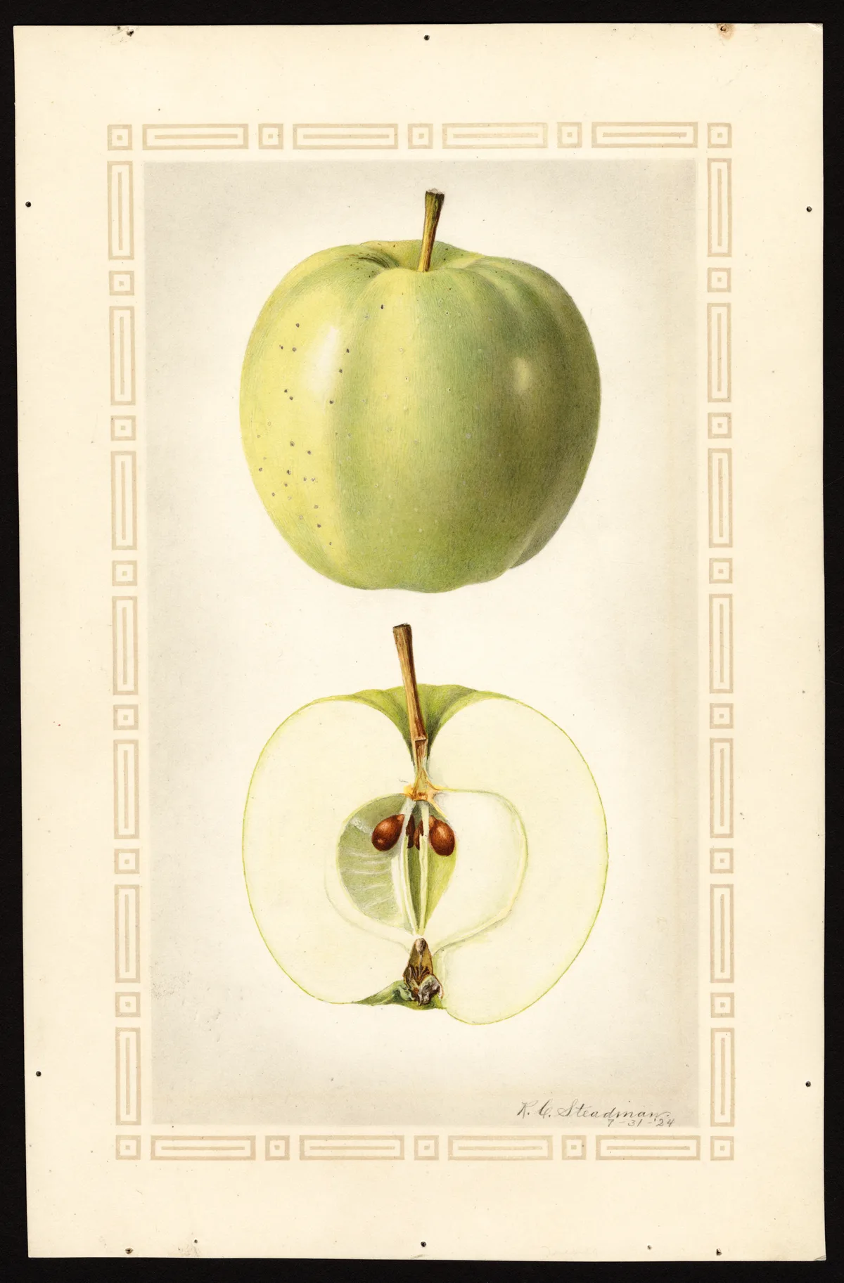 This autumn apple has been thought to be the English Codling. Warder notes it was one of Silas Wharton's varieties and "a great favorite wherever known." It was introduced to the notice of the Ohio Pomological Society in 1852 by R. W. Steele, Esq., of Dayton, Ohio, who described it as "A large, white apple, of excellent flavor, and is highly esteemed both for eating and cooking. It ripens in August. The tree is a vigorous grower and an abundant bearer. It was introduced here many years ago by Silas Wharton, of Warren County, to whom this portion of the Miami Valley is largely indebted for the introduction of many excellent varieties of apples and pears." Downing describes it as "a variety somewhat grown in Ohio and the West, the origin or identity of which has not yet been discovered." Elliott concurs that the history is unknown but adds: "We think it an old English apple belonging to the class of codlins. Our warm suns and rich soils have so improved it that it is often a right good table fruit, and always valuable for cooking." Thomas notes it was "valued at the West."