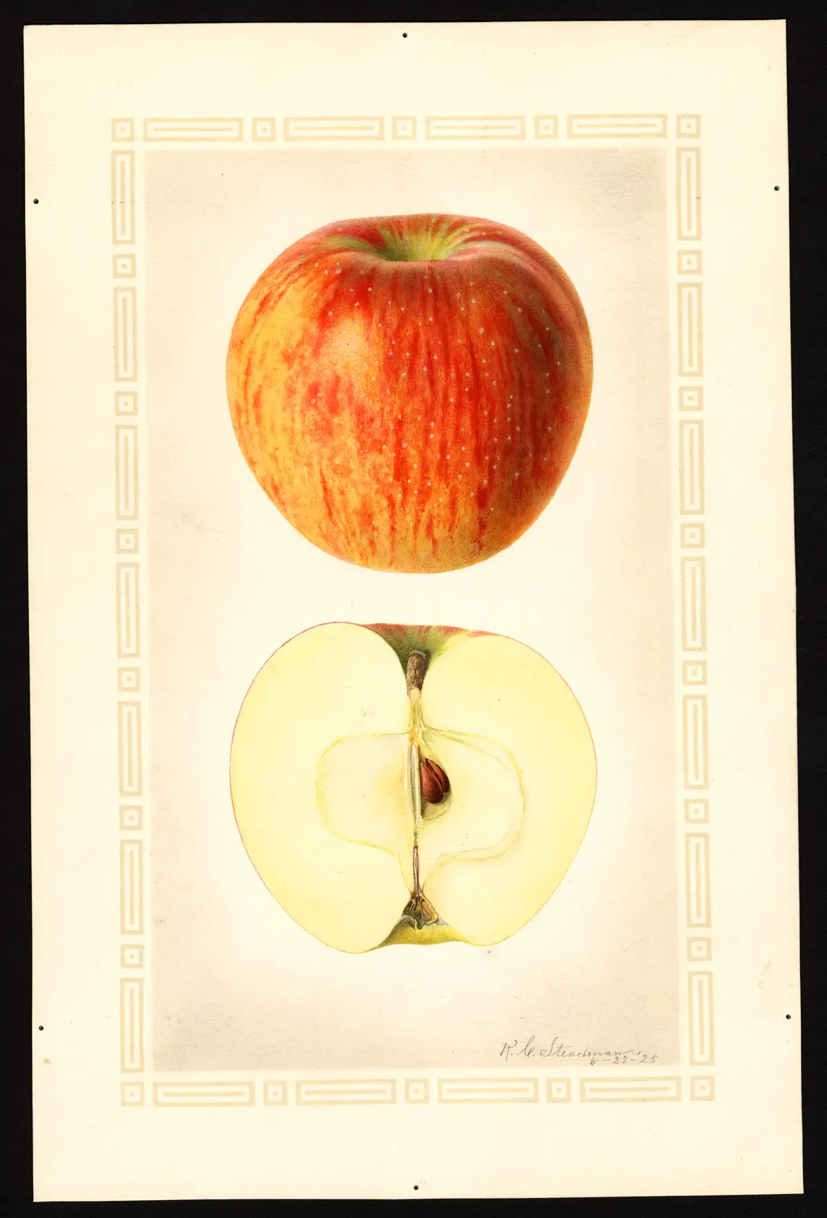 Fruit medium to large or very large. Form globular, usually inclined to conic, base rounding or sometimes flattened, nearly regular; sides often a little unequal. Stem short and rather thick or sometimes long. Cavity below medium to medium, acute to somewhat acuminate, rather shallow to deep, narrow to moderately broad, occasionally lipped, often somewhat furrowed, usually thinly russeted. Calyx below medium to rather large, usually somewhat open; lobes a little separated and broad at the base, narrow above, long, acute to acuminate. Basin small to medium, narrow to moderately wide, medium in depth, abrupt, somewhat furrowed, wrinkled. Skin rather thin, tough, smooth, somewhat waxy, greenish or yellow, washed and mottled with red, conspicuously splashed and striped with bright carmine and overspread with thin bloom. Dots numerous, russet or whitish and rather conspicuous, often submerged. Prevailing effect striped red. Calyx tube rather large, wide, cone-shape with core lines meeting, sometimes becoming funnel-form with clasping core lines. Stamens basal or nearly so. Core below medium to above, axile or sometimes abaxile; cells not uniformly developed, usually symmetrical and more or less open, sometimes closed; core lines meeting if the calyx tube is cone-shape, clasping if it is funnel-form. Carpels variable, ovate to broadly obcordate, sometimes a little emarginate, often tufted. Seeds dark, medium in size, rather long, somewhat acute; often many are abortive. Flesh whitish tinged with yellow, firm, rather fine to a little coarse, crisp, tender, very juicy, pleasant subacid, sprightly, good to very good. Season from September or October into early winter.