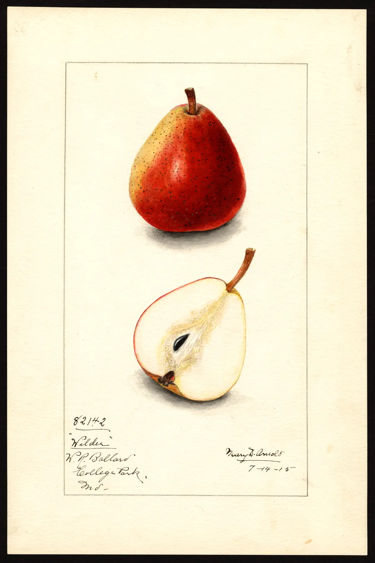 — John J. Thomas, The American Fruit Culturist (1903)Wilder. Large, pyriform; pale yellow, shaded dark russet red; dots small, numerous; flesh pale yellow, fine-grained, tender, sub-acid, juicy. A Fox seedling. Very good.