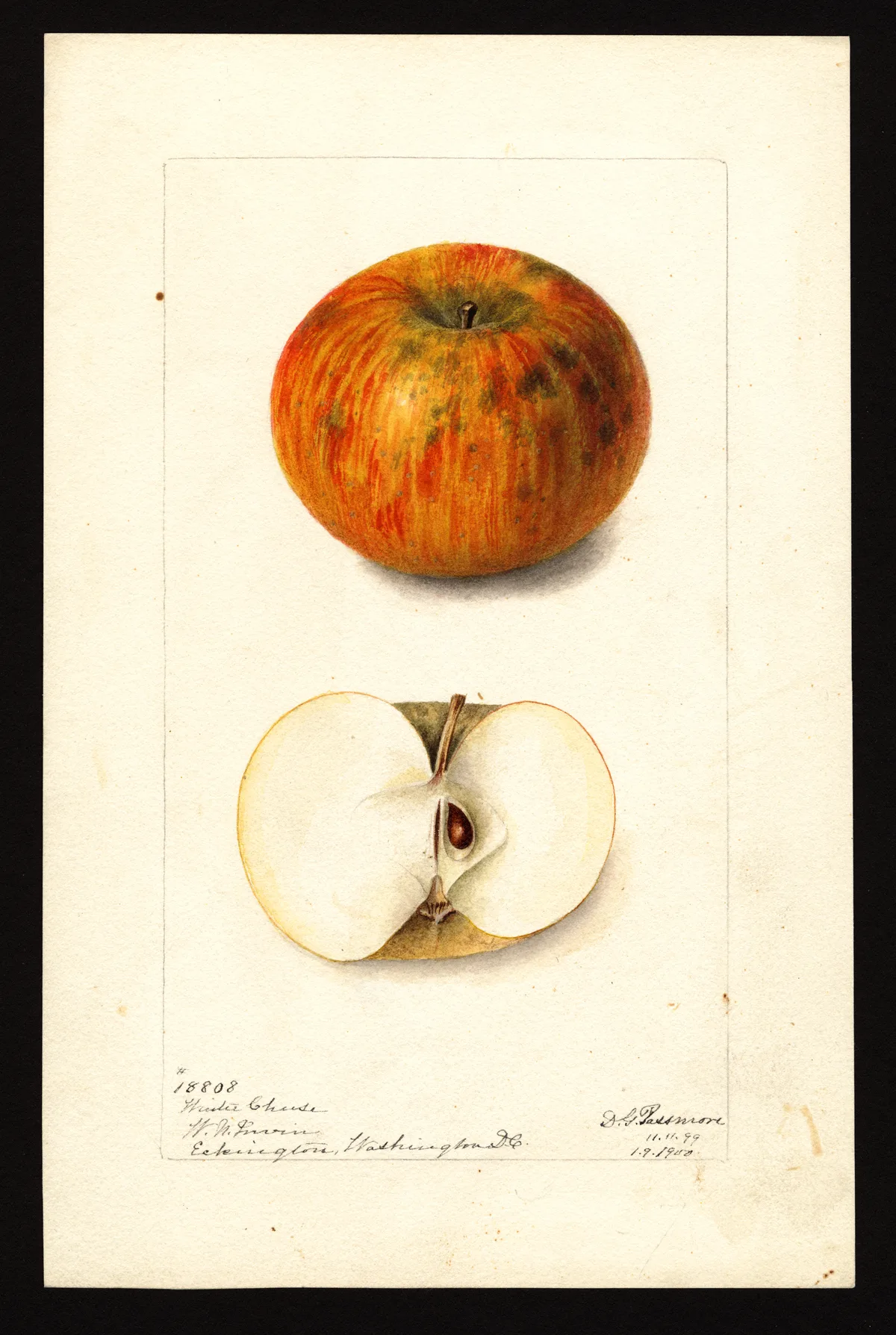 — John J. Thomas, The American Fruit Culturist (1903)Winter Cheese. (Green Cheese.) Medium in size, oblate; green in the shade, red in the sun; flesh very crisp, very tender and delicate, sprightly, and of a fine, pleasant flavor. One of the most highly esteemed early winter apples of southern Virginia, closely resembling the Fall Cheese, but a longer keeper. Becomes mealy and insipid after maturity.
